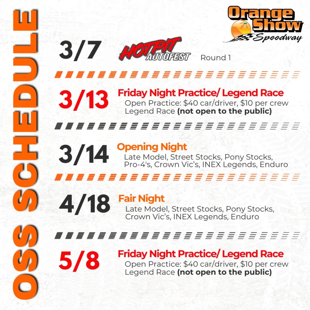 Orange Show Speedway is located 1.0 Mile north of I-10 on I-215 to Orange Show Road, then .3 miles east, then .5 mile north on E Street. (Fairgrounds). 689 South ‘E’ Street, San Bernardino, California 92408